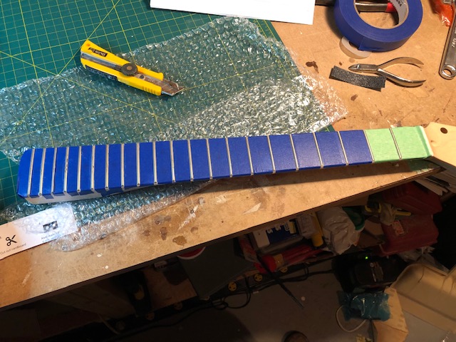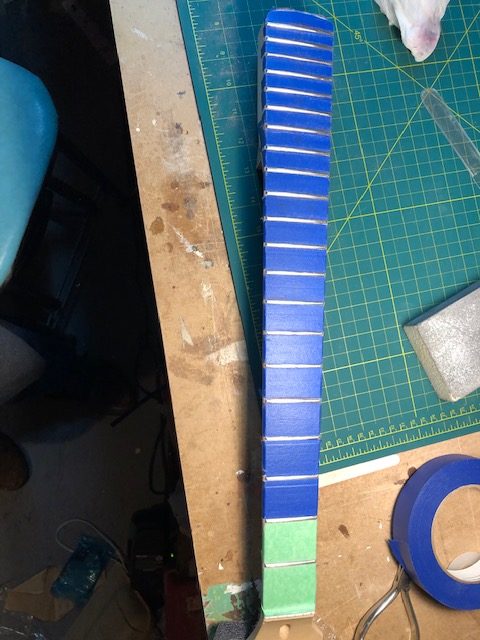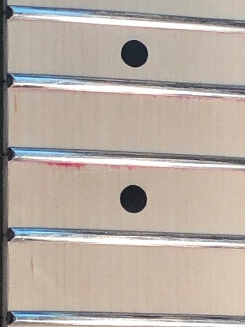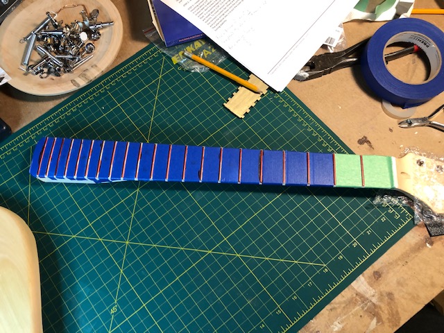 Sacrifice to the Guitar Gods. After I taped up the fret board and put the red sharpie on the frets, I went back to You Tube and the web to make sure I was doing everything correctly. Unfortunately, I found a sight that said “If you have a maple fret board, DO NOT mark the frets with a sharpie, as it may bleed through the masking tape and stain the maple”. Man, I wish I had found this site about 20 minutes earlier. If nothing else, I would have used a different colour. As you will see in the pics, there was some bleed through. I will now officially change my story. In order to appease the Guitar Gods, I had to make a blood sacrifice and the red marks are what I could not get clean.